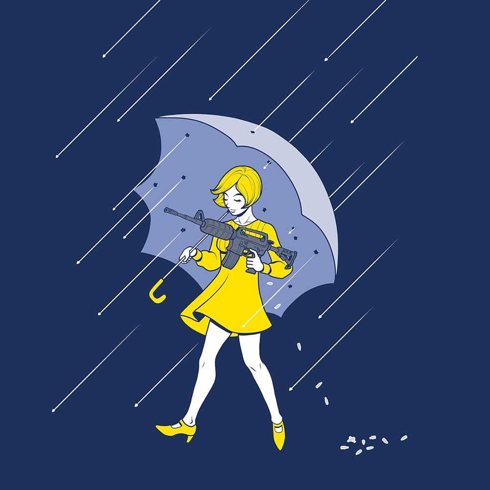 A parody of the famous Morton's salt container, this design is a cheeky play on the words "assault rifle" as "a salt rifle". It's raining bullets and the yellow haired girl is packing, carrying her own rifle and leaving a trail of empty brass shells behind her.