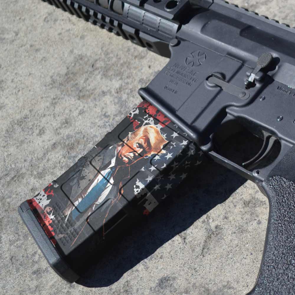 Upgrade your AR-15 with our striking mag skin featuring an epic design of President Donald Trump with the American flag waving boldly behind him. Crafted from high-quality, durable vinyl, this skin ensures a perfect fit and easy, bubble-free application. Display your patriotic pride and support with this powerful and visually stunning accessory.