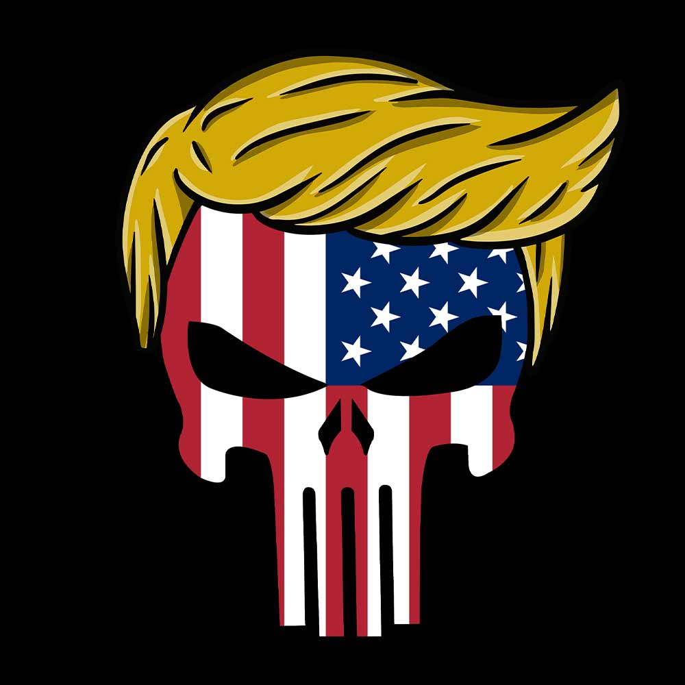 This parody combines the iconic hairstyle of Donald Trump with an American flag overlayed Skull design. The superhero skull symbolizes anti-establishment, an insistence of taking matters into your own hands. President Trump won the 2024 election with the goal of "taking American back".