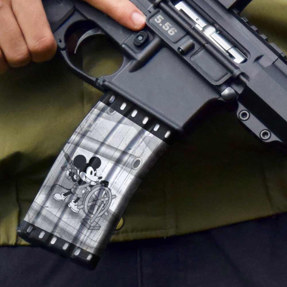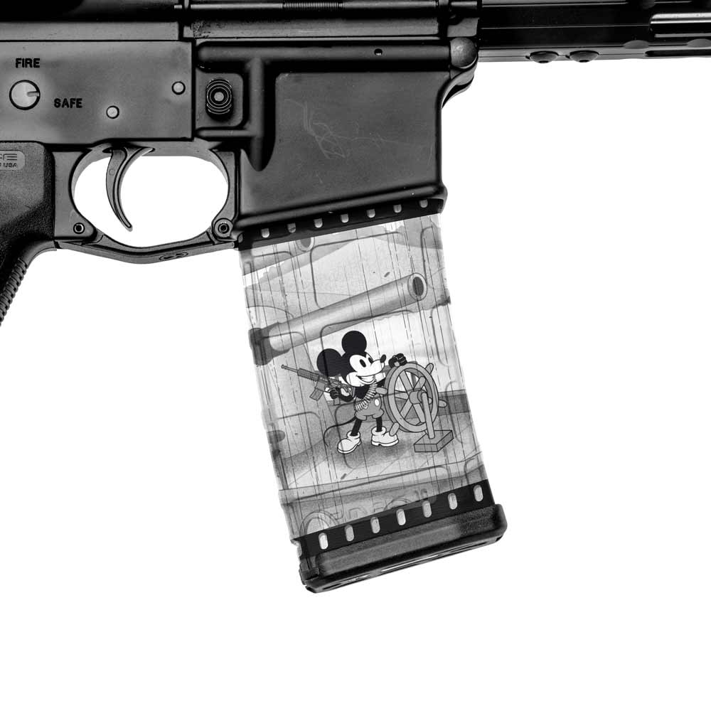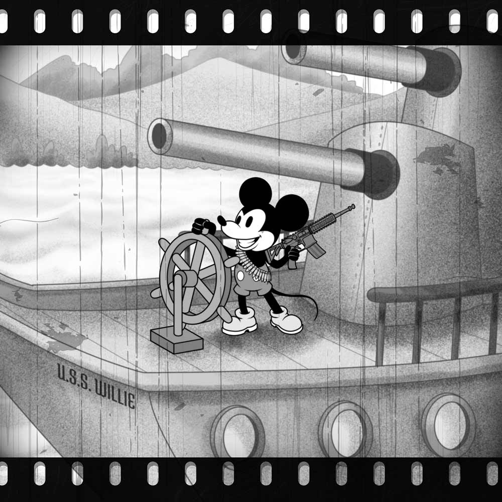 A tactical new take on the classic Steamboat Willie featuring Mickey Mouse. This cartoon character is now a part of the public domain, which means nowhere will it be safe for the Mouse to hide these days on the internet. That's why he's got to arm himself and keep his wits about him!