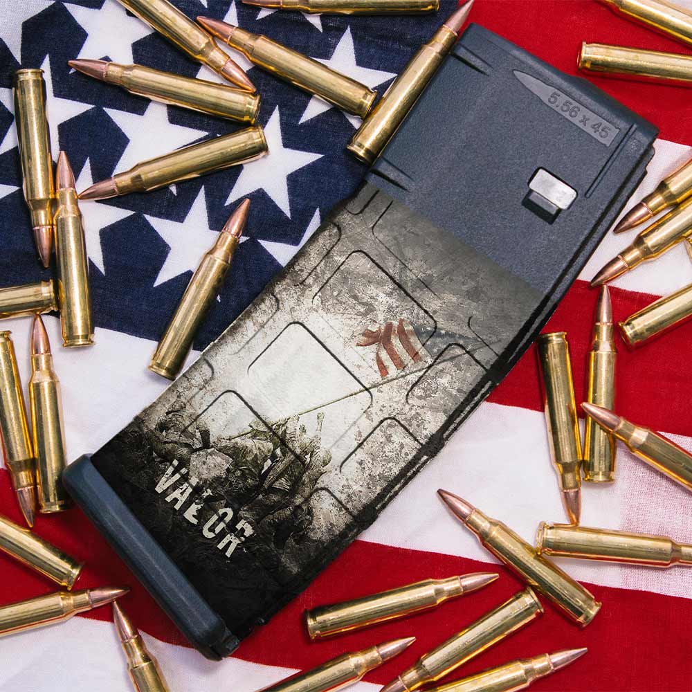 This design honors our fallen heroes. The iconic photograph features the raising of the U.S. flag on the summit of Mt. Suribachi in Iwo Jima. A powerful statement to dress your rifle with.